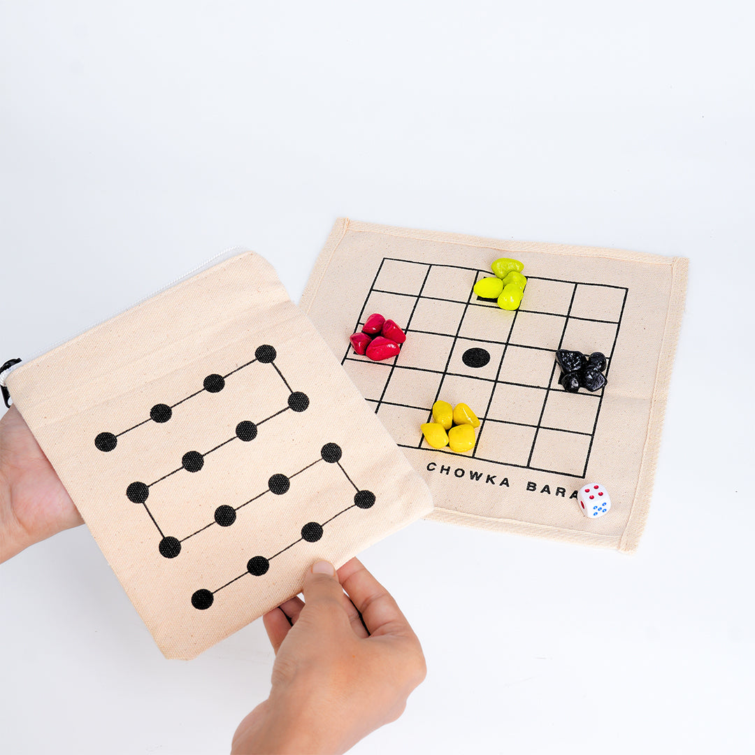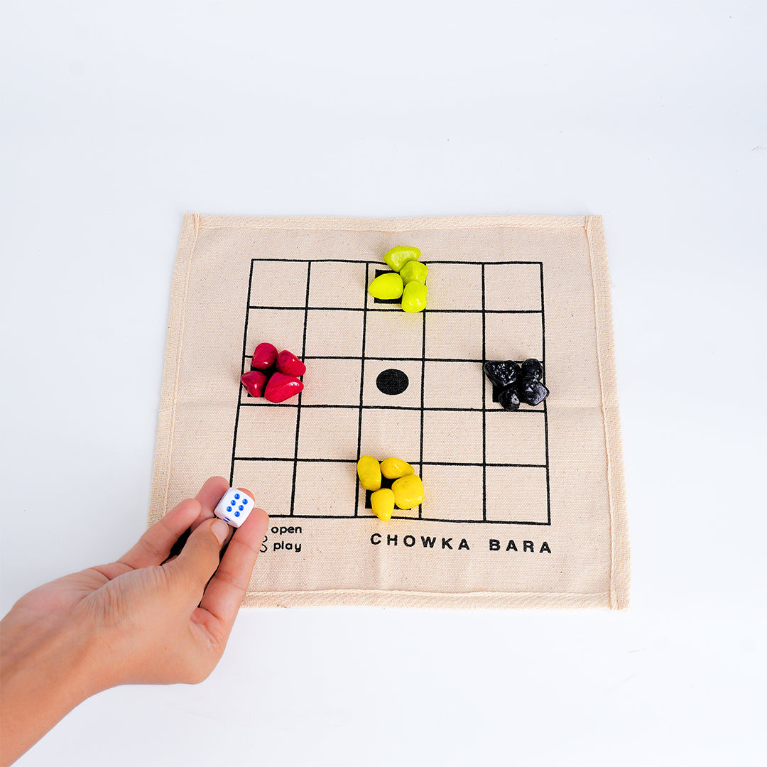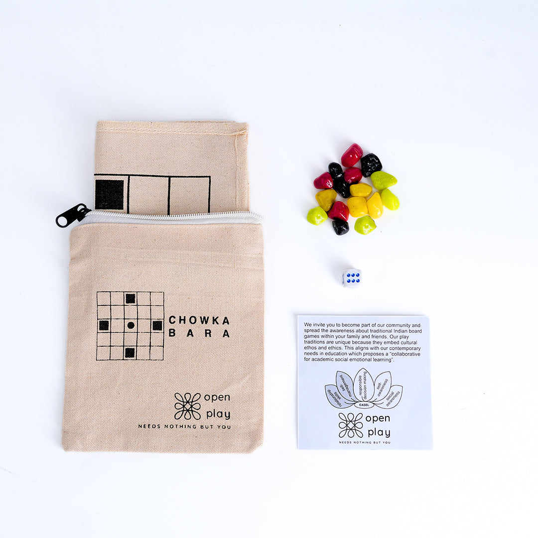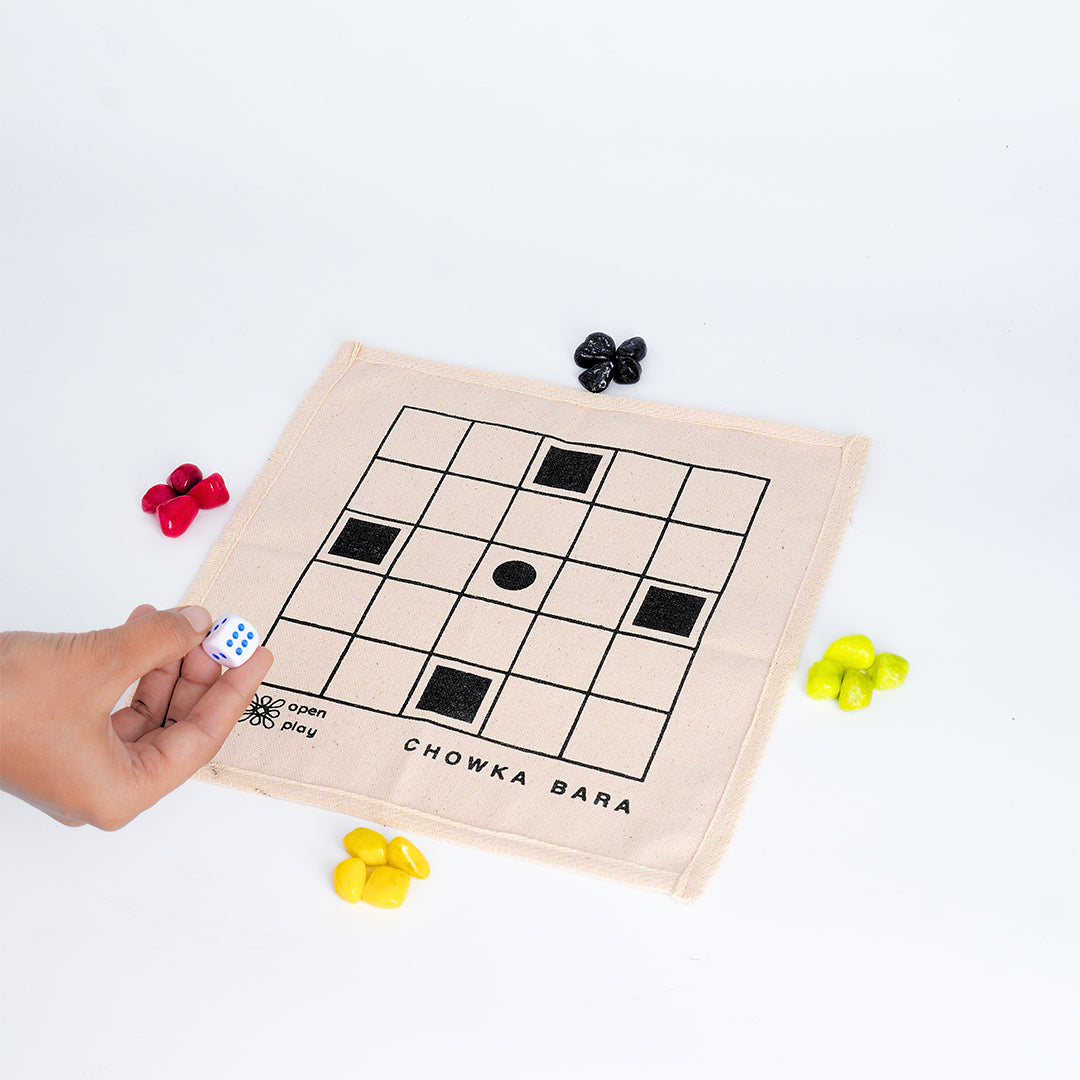 “Chowka Bara” is a 'race game' wherein two, three or four players race their respective markers on a board of 5x5 squares to reach the innermost square (marked with a black circle). The game is very similar in design to 'Dayakattai' played in Tamil Nadu. It is variously known as 'AshteKashte', 'Thaayam', 'Chakaara', 'Changa Po', 'ChomalIshto', 'Teri Chowk', etc., and is among the most ancient engagements of Indian people.