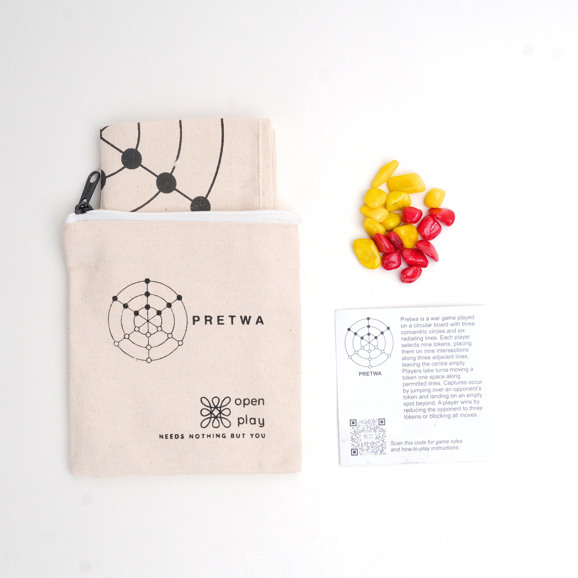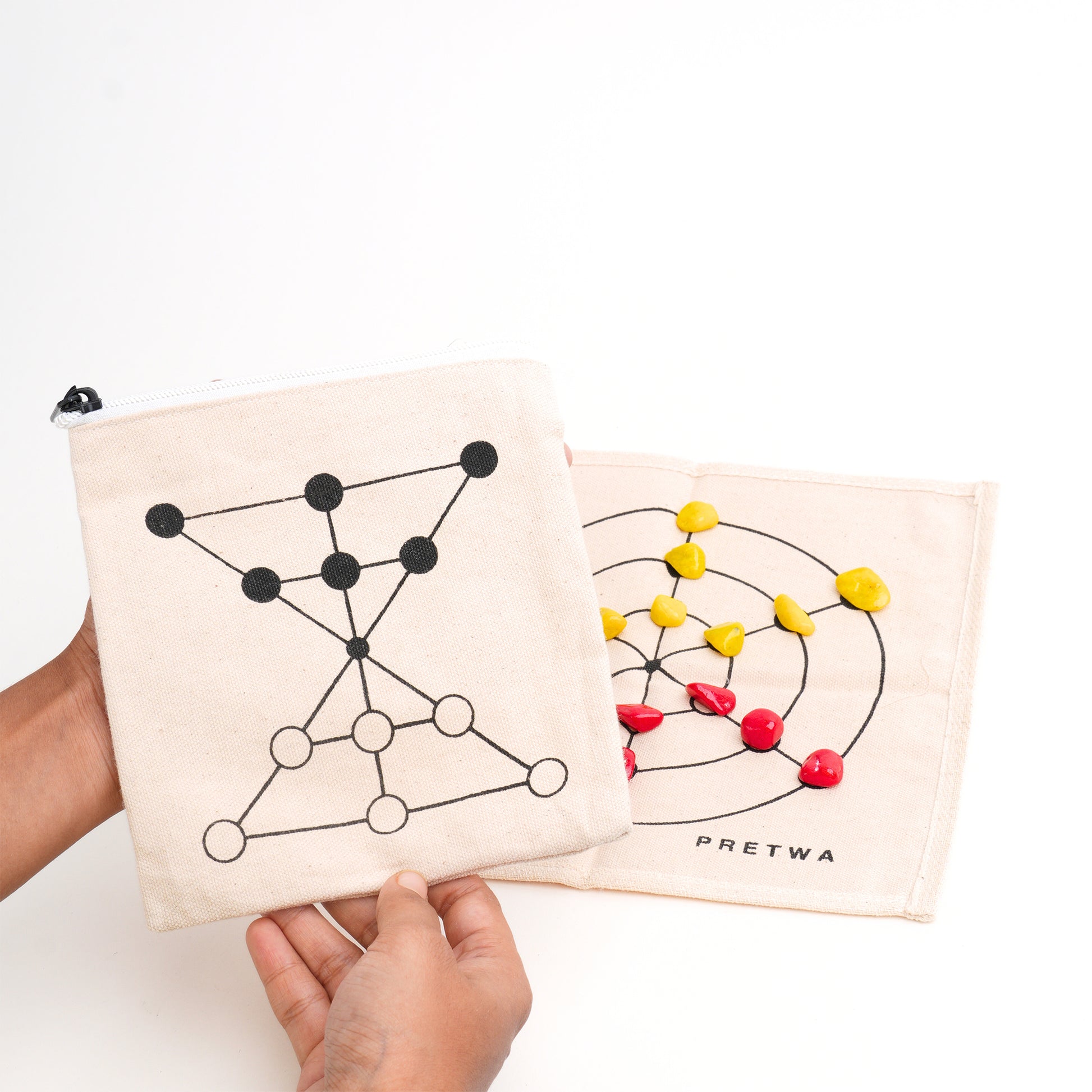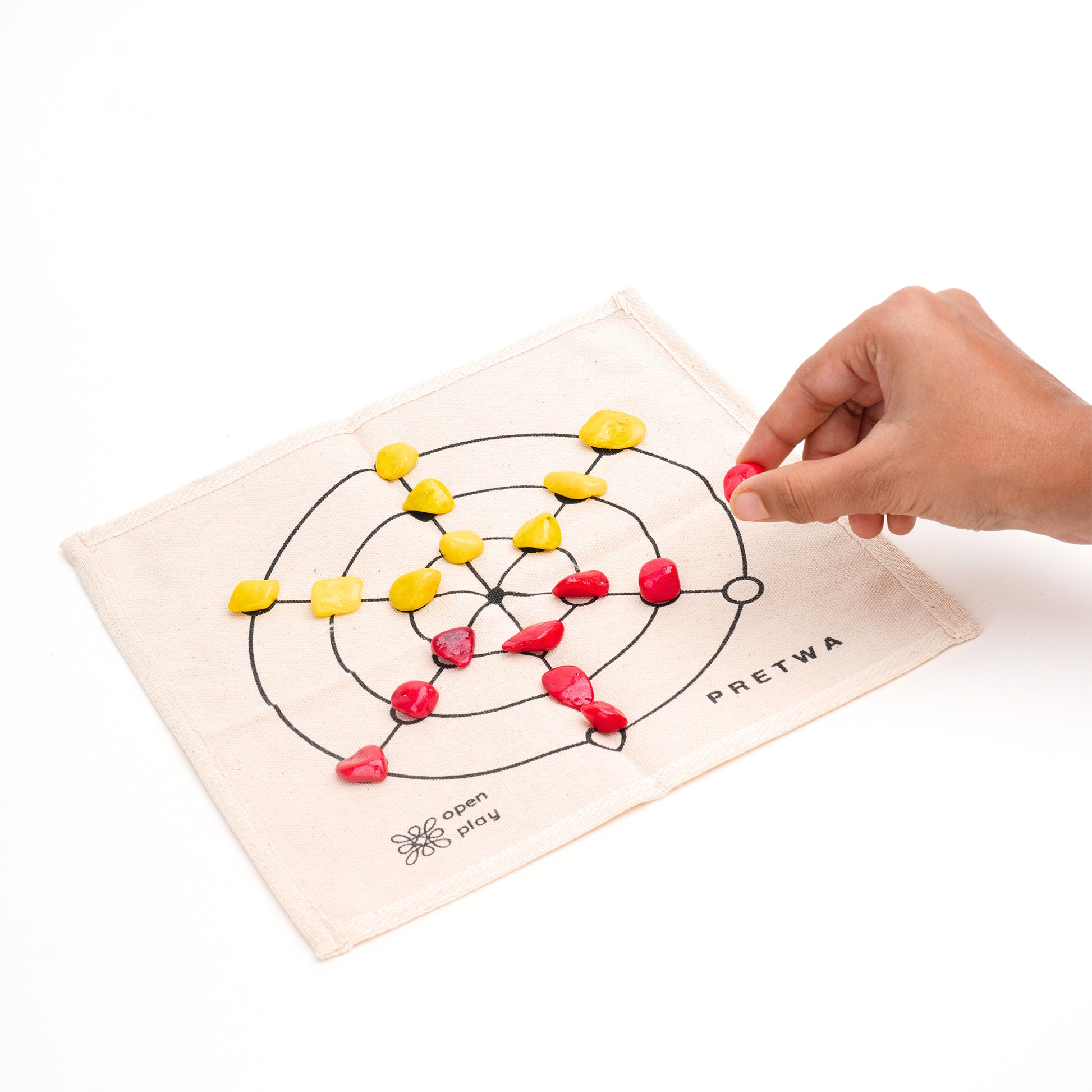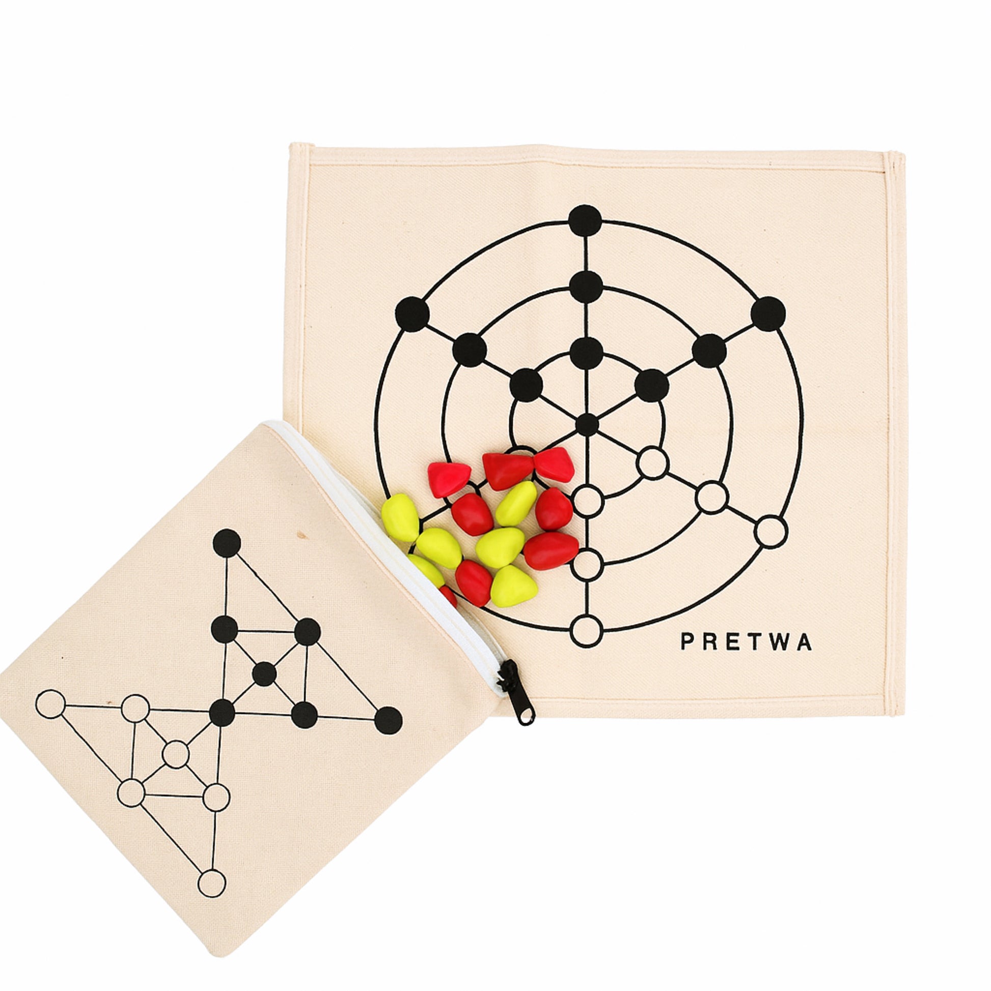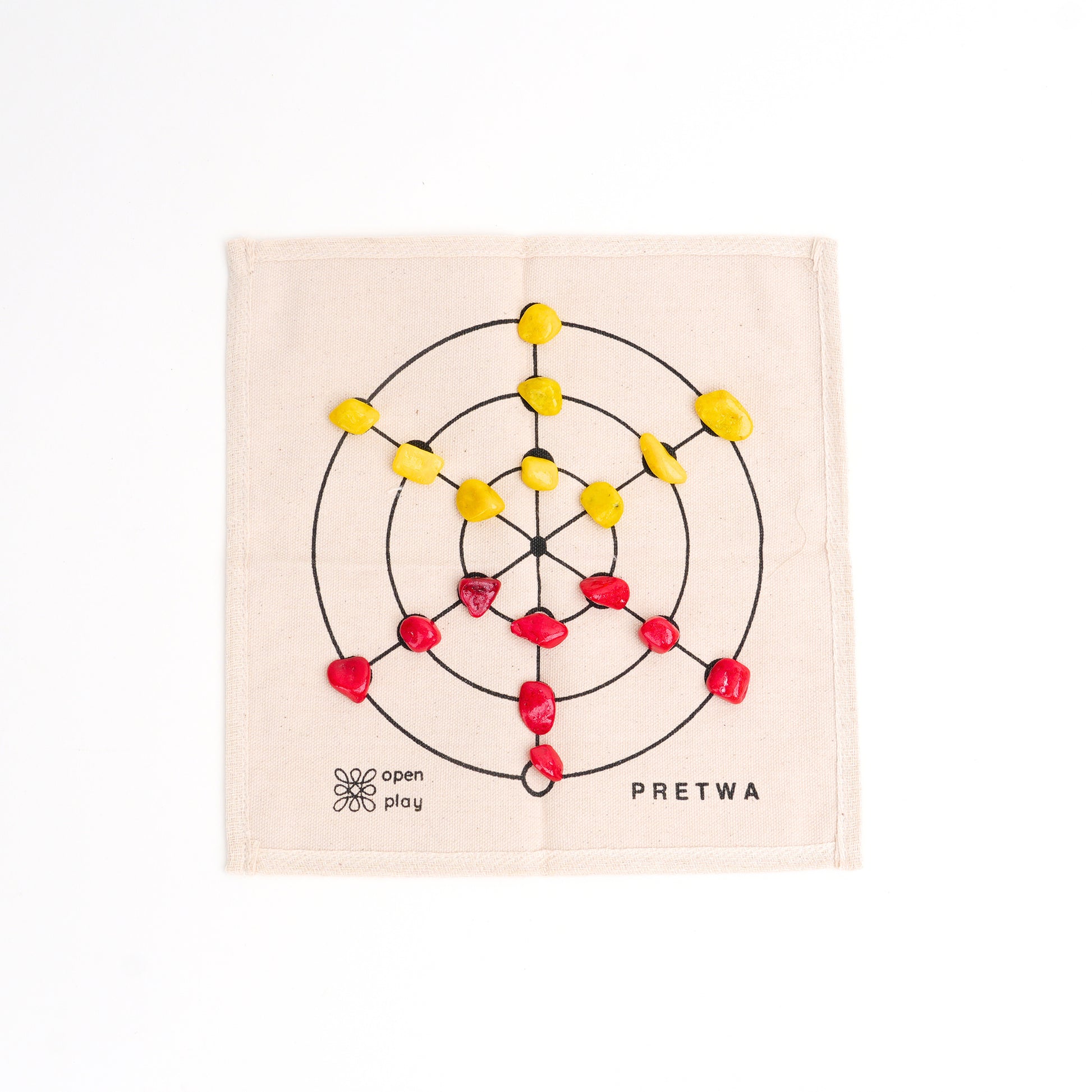 Pretwa is a traditional Indian strategy game belonging to a category known as Indian war games, which also includes Lau Kata Kati, Dash-Guti, Egara-Guti, and Gol-Skuish. These games share a distinct characteristic: pieces are arranged on a grid-patterned board, with only one vacant space at the centre. Similar game boards have been found in ancient Indian temples and in Egyptian sites, suggesting that such games may have had ritualistic or symbolic significance. In India, they were sometimes associated with divine consultation, where gameplay symbolised the meeting of the devotee and the deity.
